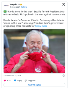 Em um post viral nesta terça-feira (28.10), o Visegrád 24, que conta com 1,4 milhão de seguidores, publicou uma série de desinformações sobre a crise: afirmou que “o presidente de extrema-esquerda Lula se recusa a ajudar” e, o mais grave, definiu o Comando Vermelho (CV) como um “grupo criminoso de extrema-esquerda cujas inclinações políticas se alinharam historicamente ao PT de Lula”.